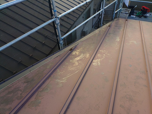 写真では、屋根全体に退色が広がり、解体中でも足跡が付着し、汚れが付きやすい状態となっていました。軒先の雪止め金具を撤去すると屋根に密着している部分の錆がひどく、穴が空いているところも目立ちます。